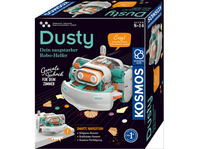 Dieser kleine Robo-Helfer sorgt für Ordnung auf dem Schreibtisch und gibt spannende Einblicke in die Technik von Saugrobotern! Ganz wild nach Staub und Krümeln fährt Dusty über den Tisch und saugt wie ein echter Saugroboter Schmutzpartikel einfach weg. Geniale mechanische Sensoren verhindern, dass der kleine Roboter abstürzt oder steckenbleibt und transparente Bauteile geben spannende Einblicke in sein Innerstes. Die farbige Anleitung erklärt den Aufbau des Roboters und zeigt, wie er den Schreibtisch ganz spielend sauber hält.