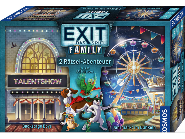 Die tierischen Superhelden Kater Milo, Hamster Häm, Hund Bella, Papagei Nele und Wanze Luis erleben zwei neue Rätsel-Abenteuer! Zuerst ermitteln sie als Band bei einer tierischen Talentshow. Hinter den Kulissen ist ein Diebstahl geplant, den die Heroes verhindern wollen. Aber auch der Jahrmarkt ist in Gefahr! Immer wieder kommt es zu mysteriösen Stromausfällen. Die Heroes vermuten Sabotage und machen sich auf den Weg, um die geheimnisvollen Vorfälle zu klären. Zwei Rätselabenteuer erleben mit den EXIT Heros! Familien und Kinder ab acht Jahren lösen Rätsel bei einer tierischen Talentshow und auf dem nächtlichen Jahrmarkt. Ein leichter Einstieg in die Escape Game-Welt von EXIT® - Das Spiel.