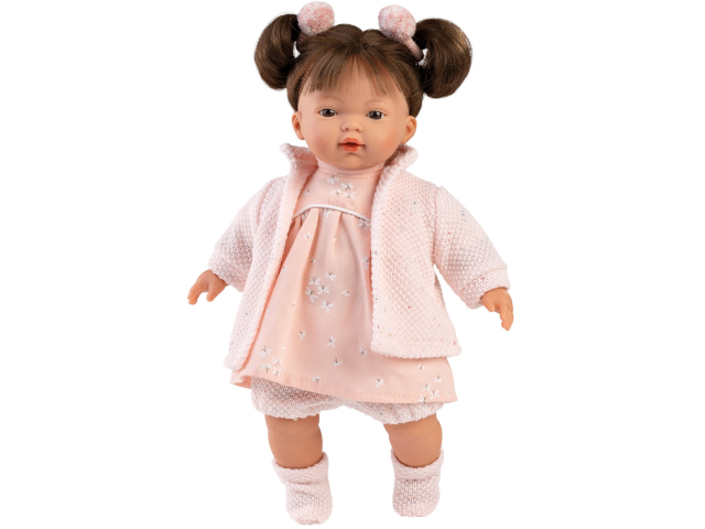 33cm große Babypuppe mit braunen Augen, frisierbarem braunem Haar und weichem Körper. Kopf, Arme und Beine sind aus Vinyl